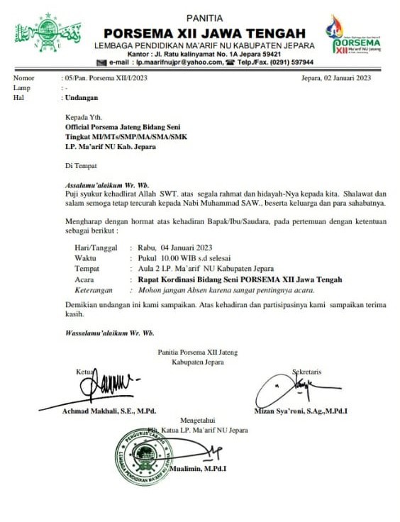 Undangan yang dikirimakan panitia kepada para official kontingen Jepara (dok.ist).
